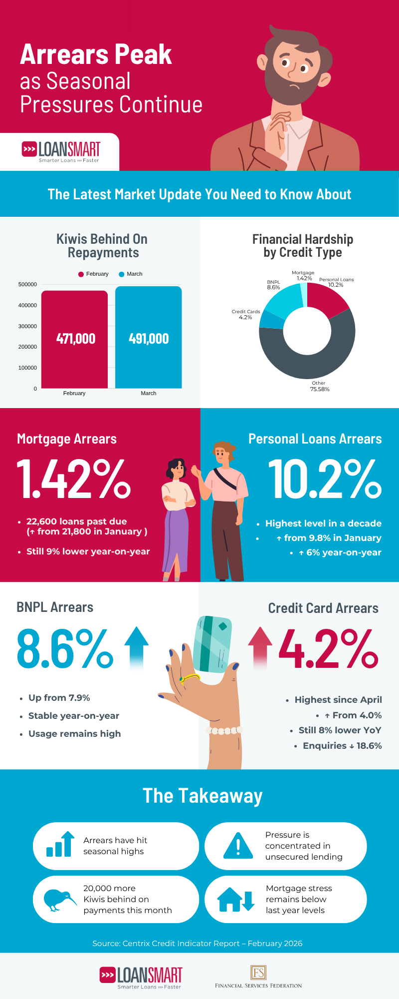 - Personal loan arrears have climbed from 9.8% to 10.2%, while BNPL arrears have risen from 7.9% to 8.6%